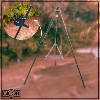 Wytrzymały składany trójnóg z kołowrotkiem, przeznaczony do grilla i ogniska. Ułatwia regulację wysokości zawieszenia naczyń nad ogniem, lekki i łatwy do przenoszenia.